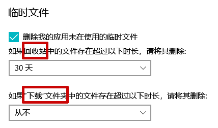 点击【配置存储感知或立即运行】,可设置该功能自动运行的条件和时间。还可以分别设置回收站、「下载」文件夹、本地可用云内容的自动删除触发条件。