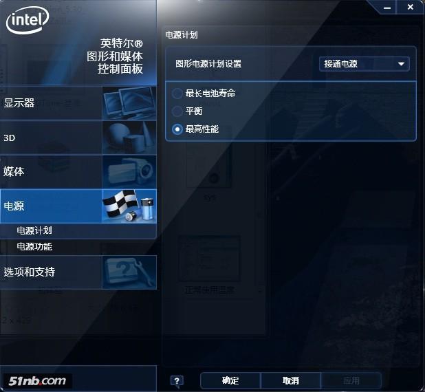 英特尔Core i系列处理器不仅可以调节性能,其集成的显卡也能够调节,在英特尔图 形和媒体控制面板内,Intel GMA HD图形电源计划提供了三种模式:最长电池寿命、平衡、最高性能。与CPU一样,这样的设计是非常人性化的,我们可以根据各自的使用需求,在不同条件下选 择不同的模式,如在户外,可以选择最长电池寿命,降低显卡频率,来得到更长的续航时间。同理,在游戏或高清视频方面,设置最高性能以得到更佳的性能体验。