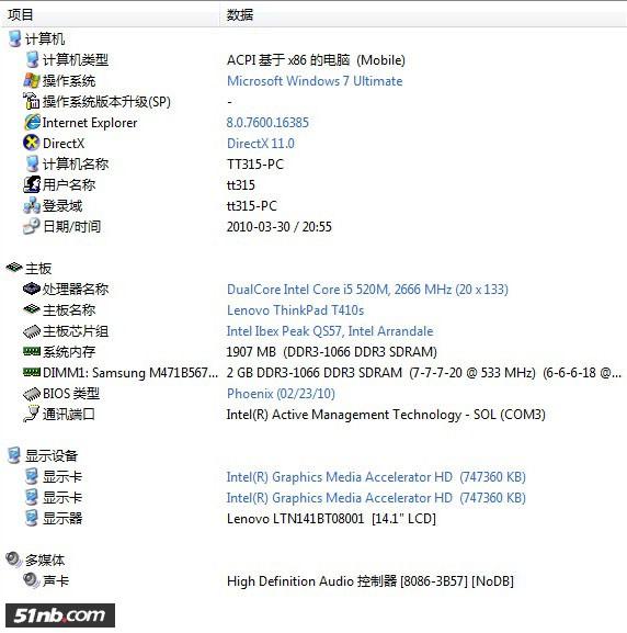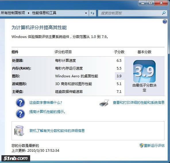 Windows 7评分及HDTune硬盘测试 T410s在Windows 7 旗舰版 32位系统下的最低评分为3.9,来自于CPU内图形核心,不过其3D和游戏性能表现非常不错,达到了5.1分。另外Core i5-520M处理器的评分达到了6.5分,固态硬盘分数最高,达到7.1分。
