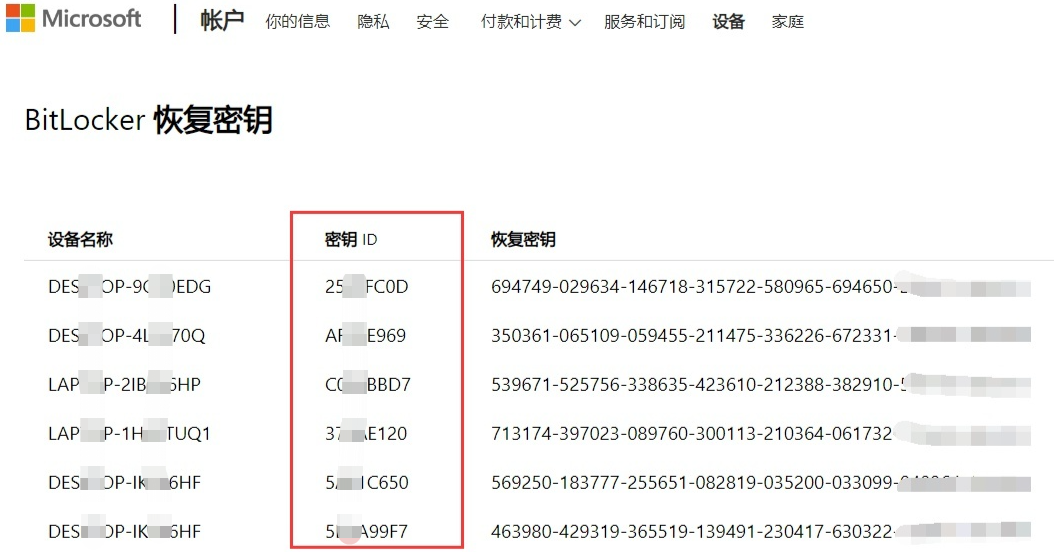 5、在密钥ID一列找到与被锁电脑恢复密钥前8位数字一致的一组。